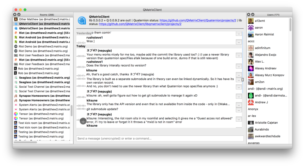 We'd also like to welcome mujx (developer of nheko) and kitsune (developer of Quaternion and libQMatrixClient) to the new core team as we start trialling the new governance structure (which mainly amounts at this point to getting review approvals on spec proposals and changes from the relevant domain experts on the new team).  This brings us to a full complement for the team: Erik (servers), richvdh (servers, crypto & clients), Dave (clients & push/identity) and uhoreg (crypto, general) from the current core team; and Anoa (servers, AS API), TravisR (integrations, AS API; acting with Dimension hat on), mujx & kitsune from the community.