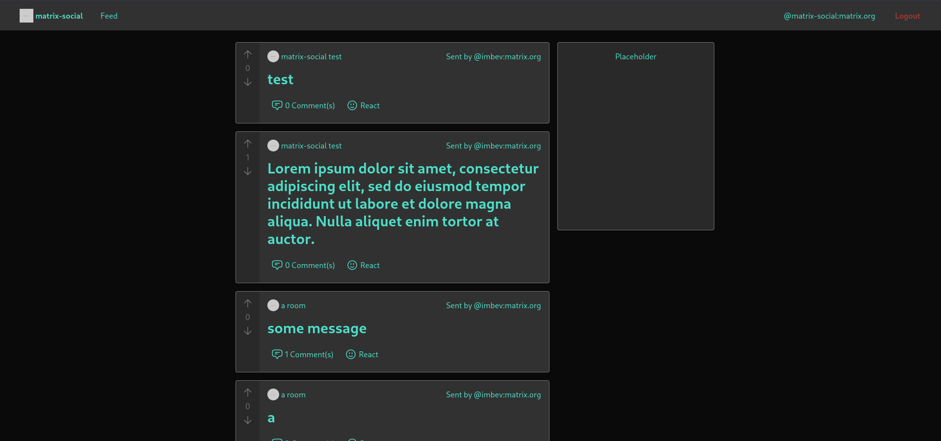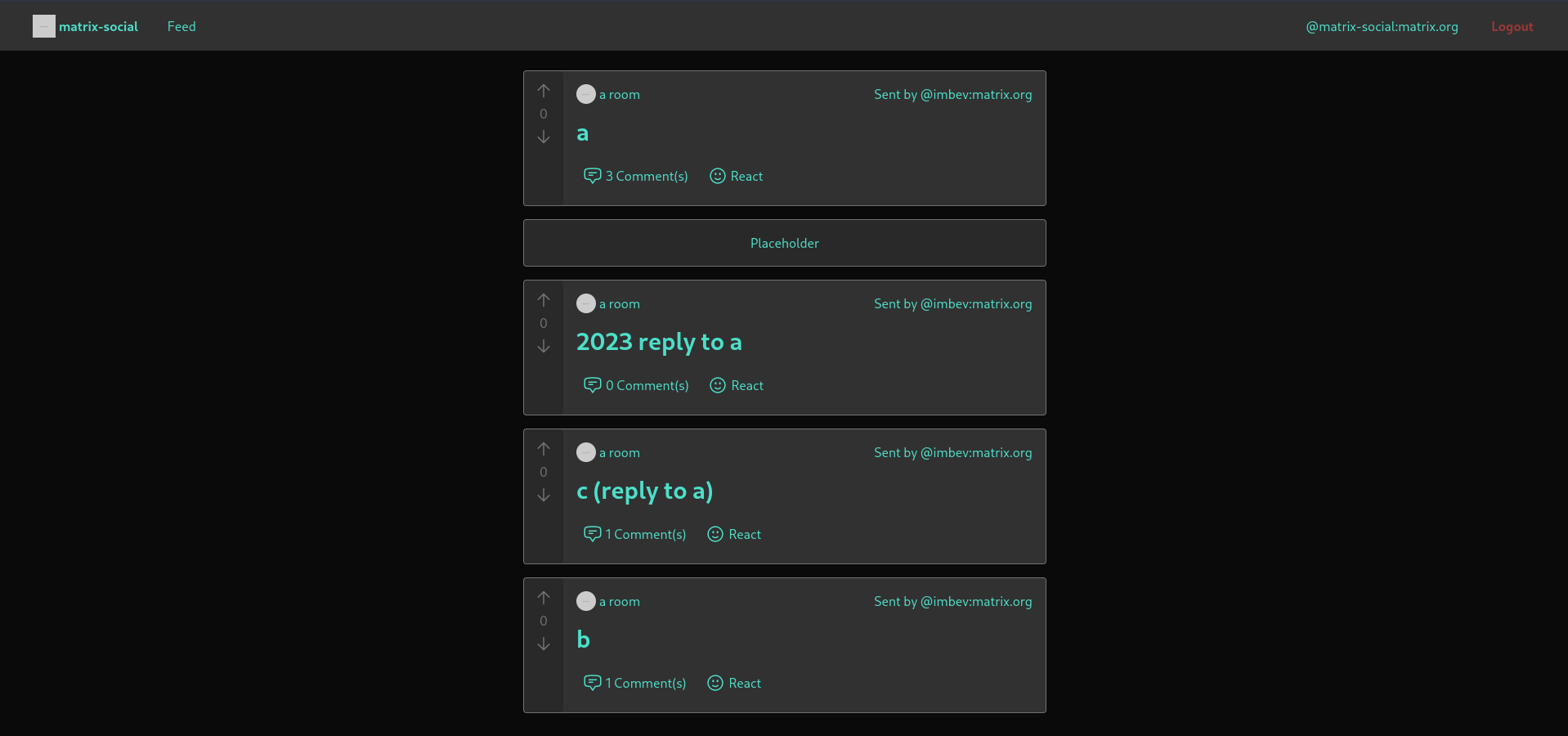 • Posts now display a comment count. There is also a "score", which can be incremented/decremented by thumbsup/thumbsdown reactions. There is currently progress on reacting from matrix-social.