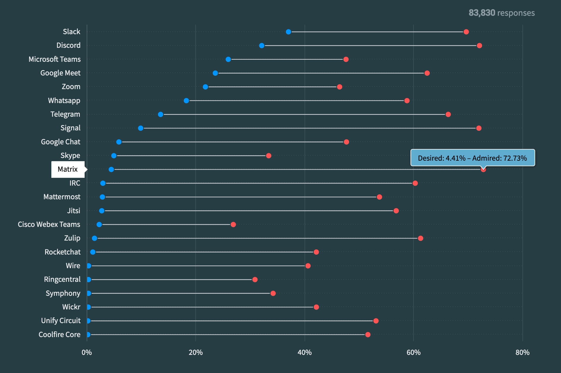 Of the 83,830 folks surveyed, Matrix was the #1 chat tool in terms of current users' satisfaction. It was also rated as the most desirable among the open source tools with open governance, but there is a lot of room for improvement in awareness. We’re excited to build on this 2024! πŸš€