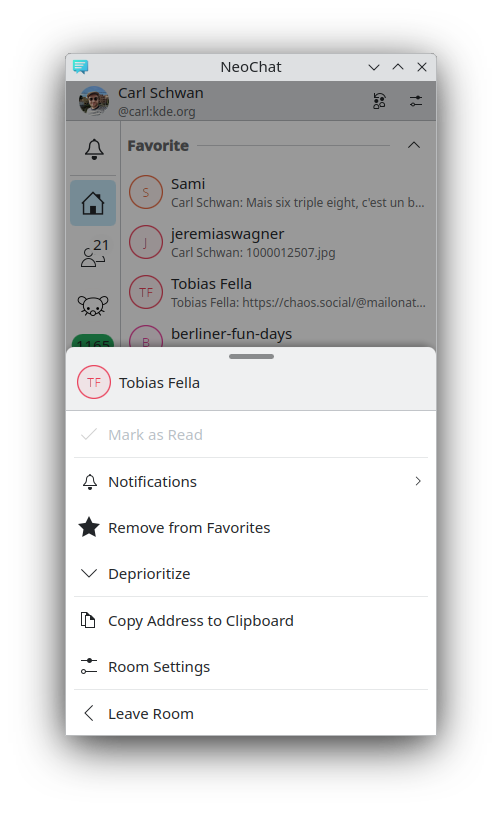 Carl has created new UI for various right-click menus that shows up as a drawer when using NeoChat on a mobile device.